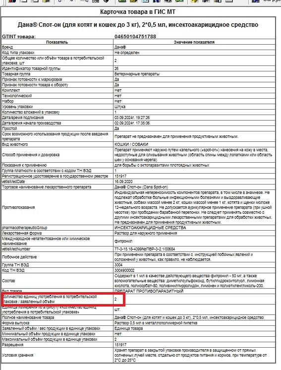 Пожалуйста, подскажите, где посмотреть значение атрибута КоличествоЕдиницУпотребленияВПотребительскойУпаковке? Как я понимаю, должен быть в карточке товара, которую заполняет производитель? Как посмотреть по GTIN карточку товара в ЧестномЗнаке? Ввожу GTIN в Поиск (скрин прилагаю), находит, но не дает открыть саму карточку.. Нужно для того, чтобы узнать, можно ли продавать вет.препарат через частичное выбытие или нет. Или я вообще не там ищу?..