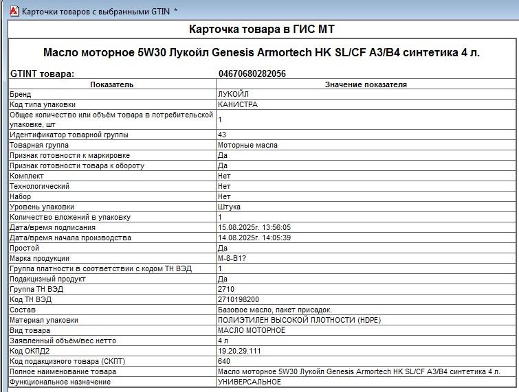 Например "Масло моторное ЛУКОЙЛ GENESIS UNIVERSAL 5w-40 1л" - оно же уже есть в национальном каталоге. И у него есть GTIN от производителя. Зачем мне давать новые GTIN и заводить эти карточки?