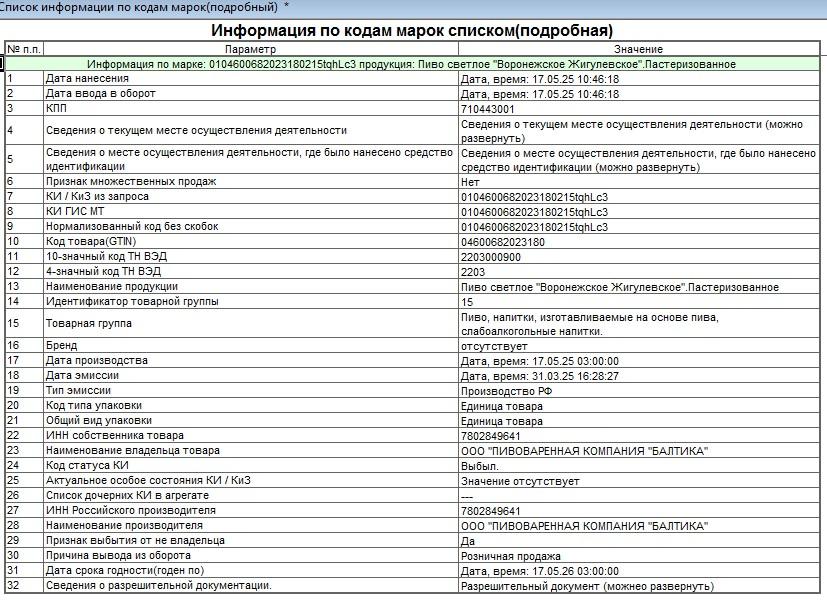 В кратце - марки при нем утитываются только при вводе в оборот производителем, и на кассе при продаже. По всей цепочке движений по УПД от производителя к оптовику1-оптовикуХХХ-рознице - передаются только GTIN-ы... И только при продаже на кассе передается марка. Соответственно, с момента ввода в оборот и до продажи, марки числятся на производителе. Но, выводит из оборота их розничный продавец продажей на ККТ. Например молочка до сих пор так учитывается. (15) "по ОСУ", так, как нет признака "прослеживаемость", поэтому владелец там производитель "Балтика" Вот пример по интереснее, марка с пачки сигарет: По РР, по токену: ![]() А это по КЭП: ![]() |